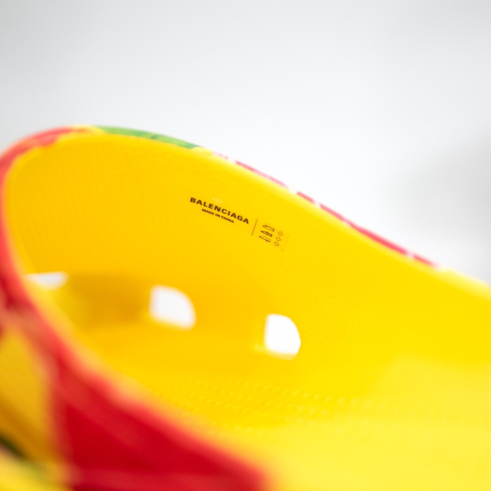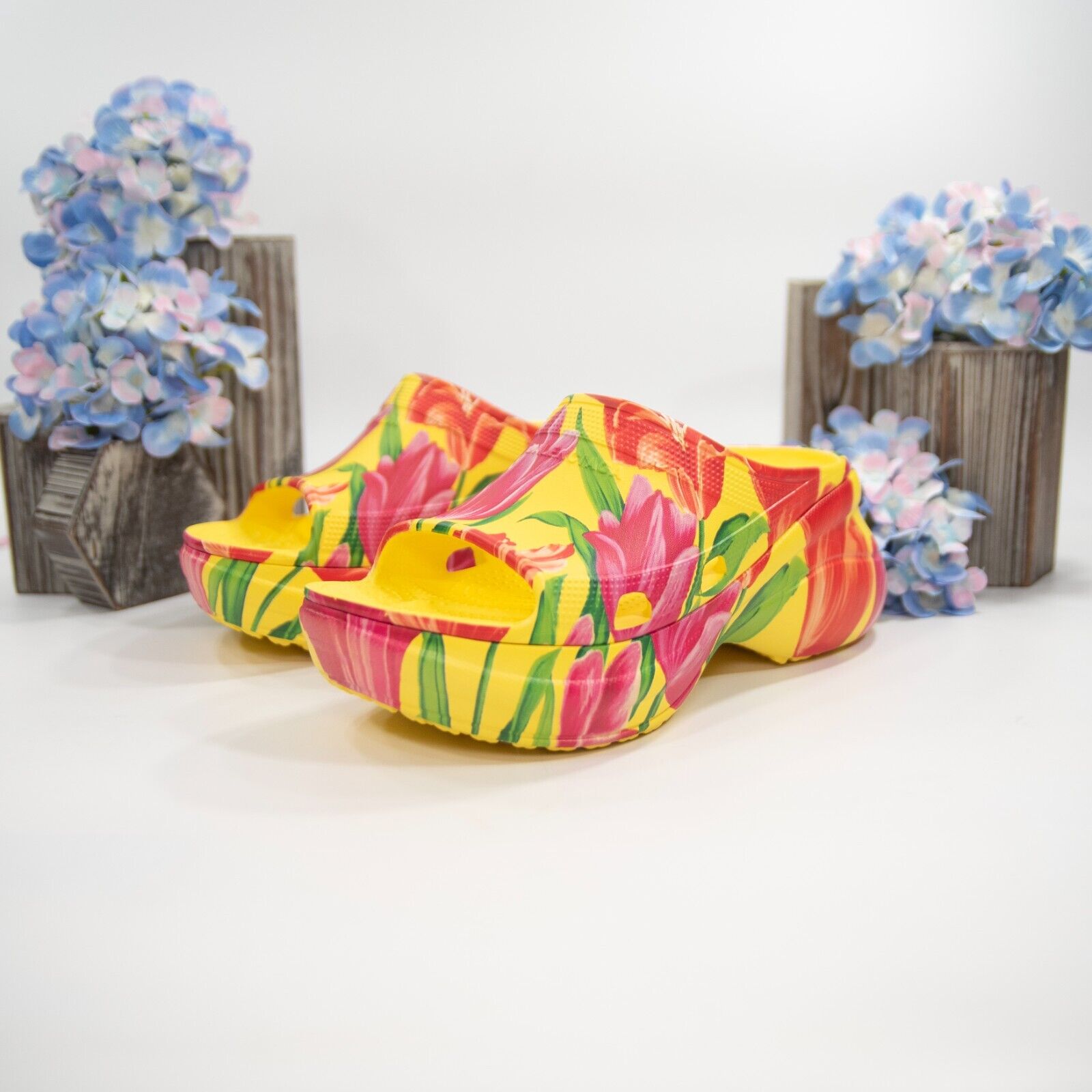 Elevate your favorite casual style with the Pool platform sandal from Crocs x Balenciaga. This collaboration features a simple slide silhouette, complete with a molded heel that takes your look to the next level. Decorated with a tulip print for a bold pop.