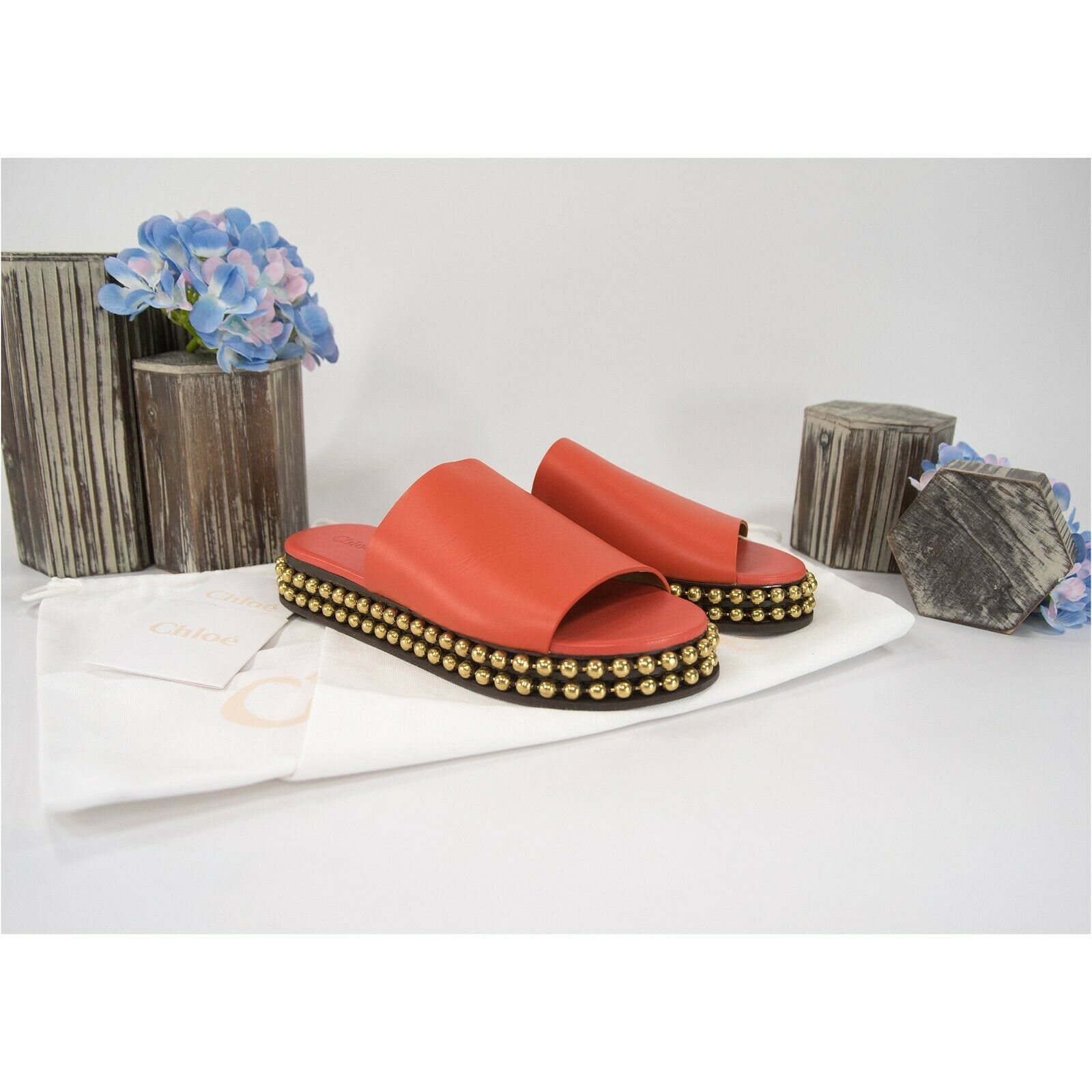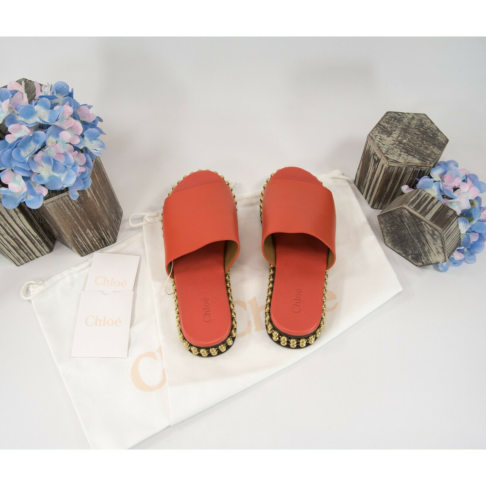 Chloe Orange Leather Bead Chain Flat Mules Slides Sz 37 NIB