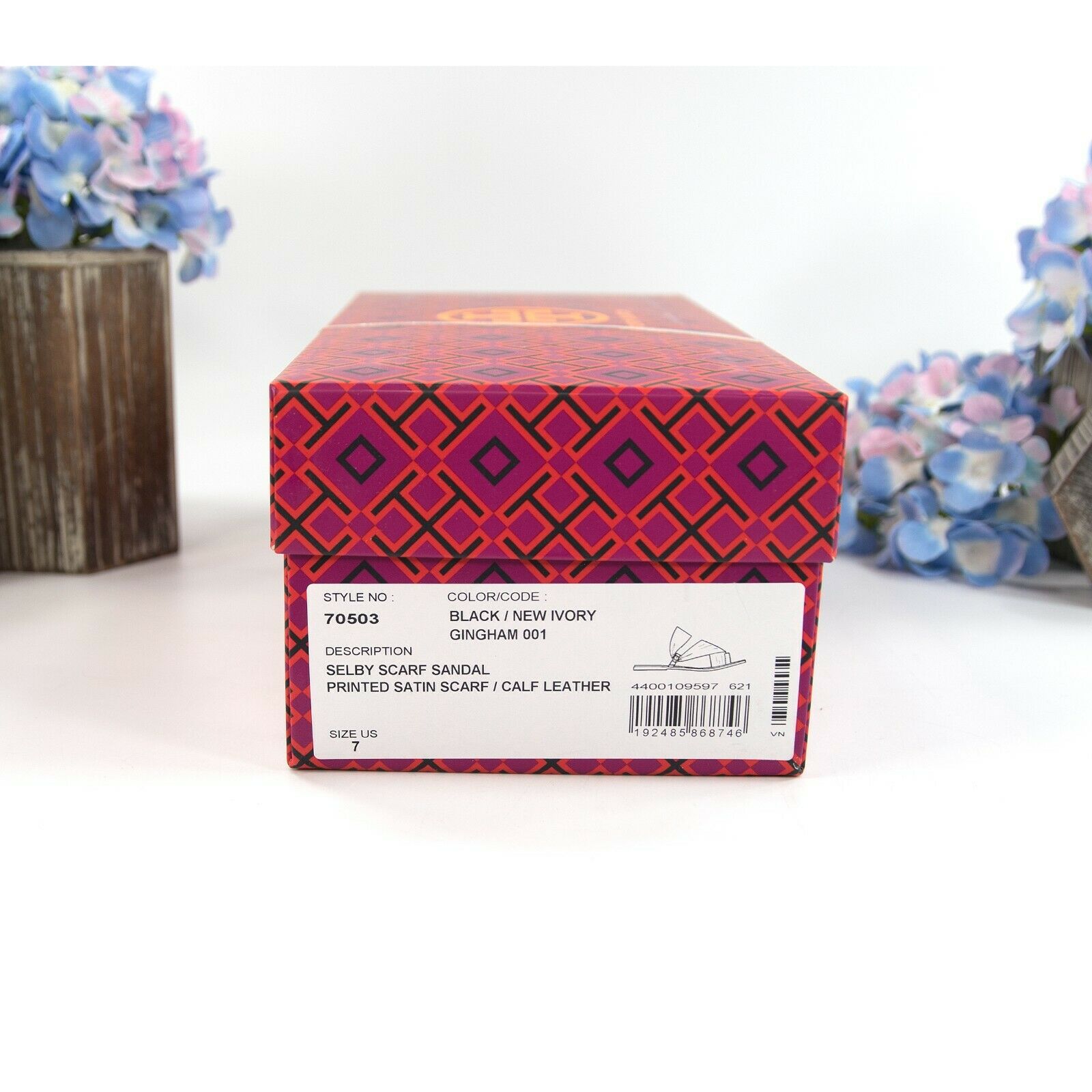 Tory Burch Black New Ivory Gingham Twill Leather Selby Scarf Sandals Size 8 NIB