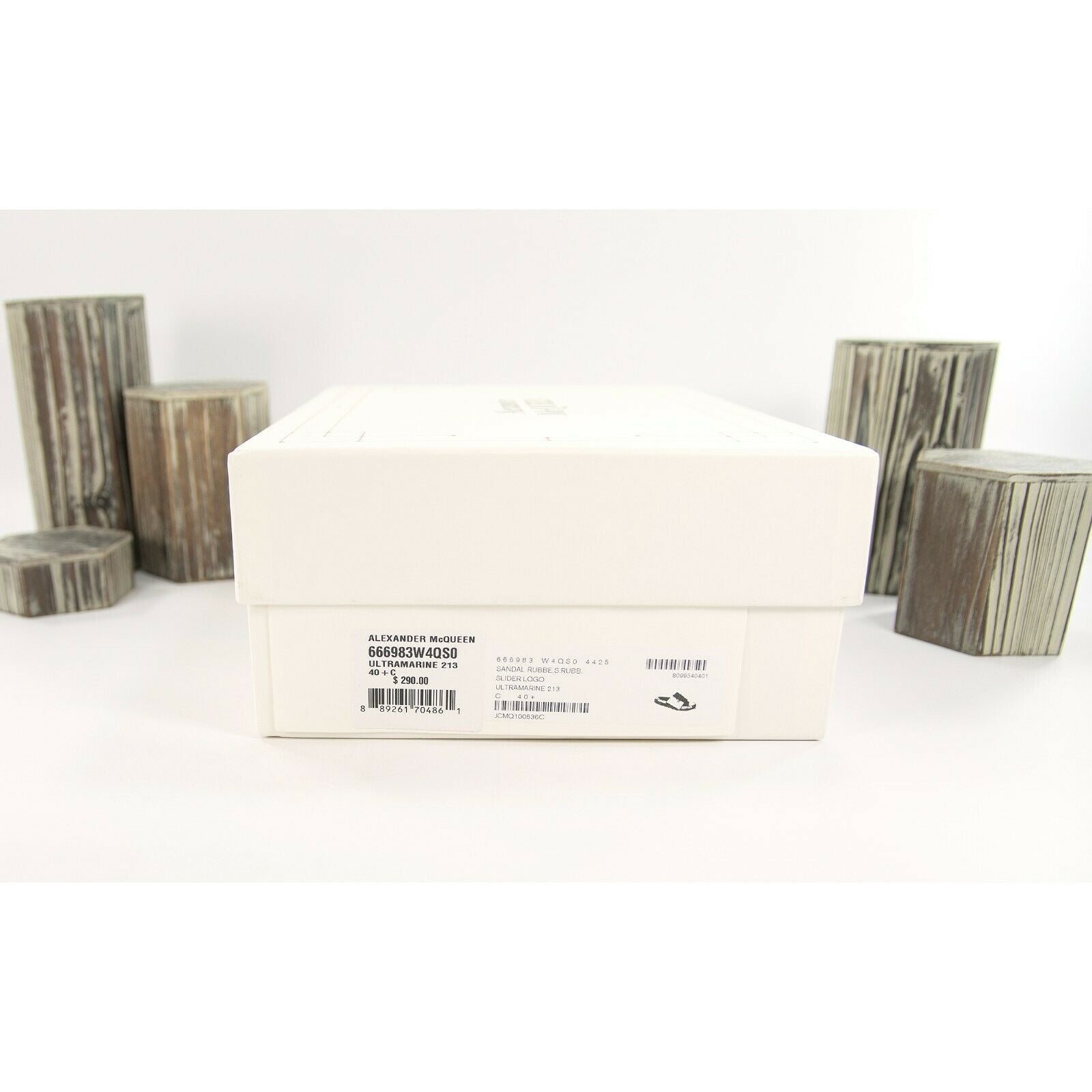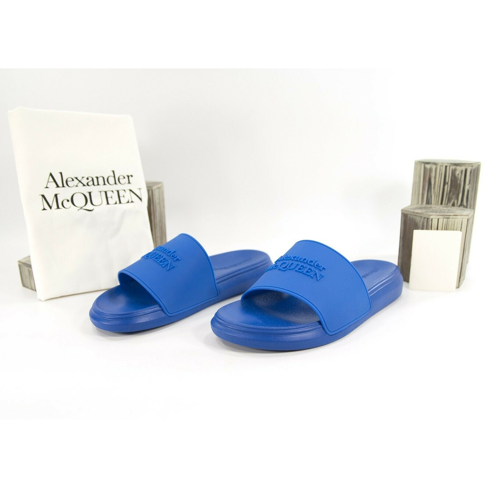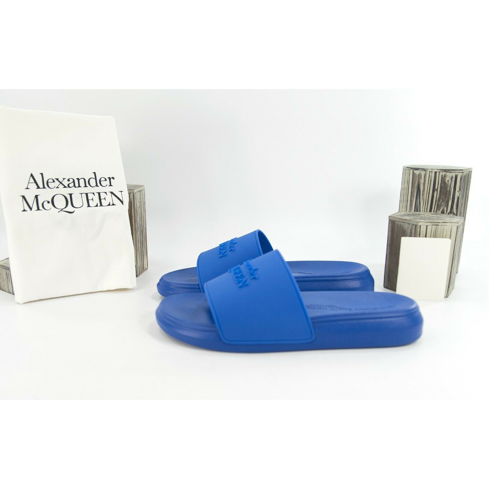 Alexander McQueen Blue Embossed Logo Leather Rubber Pool Slides 40.5 NIB