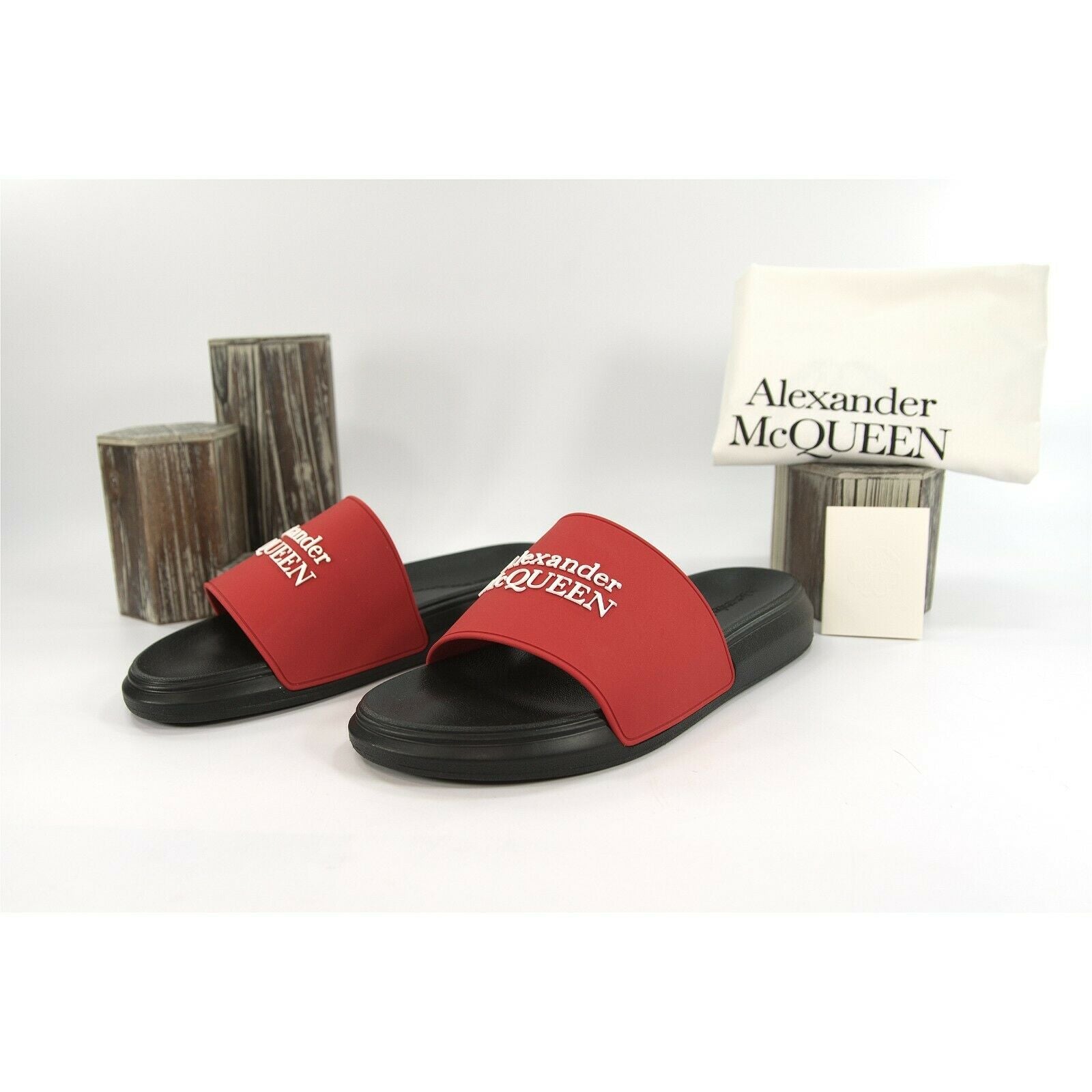 Alexander McQueen Mens Lust Red Black Debossed Logo Rubber Pool Slides 45 12 NIB
