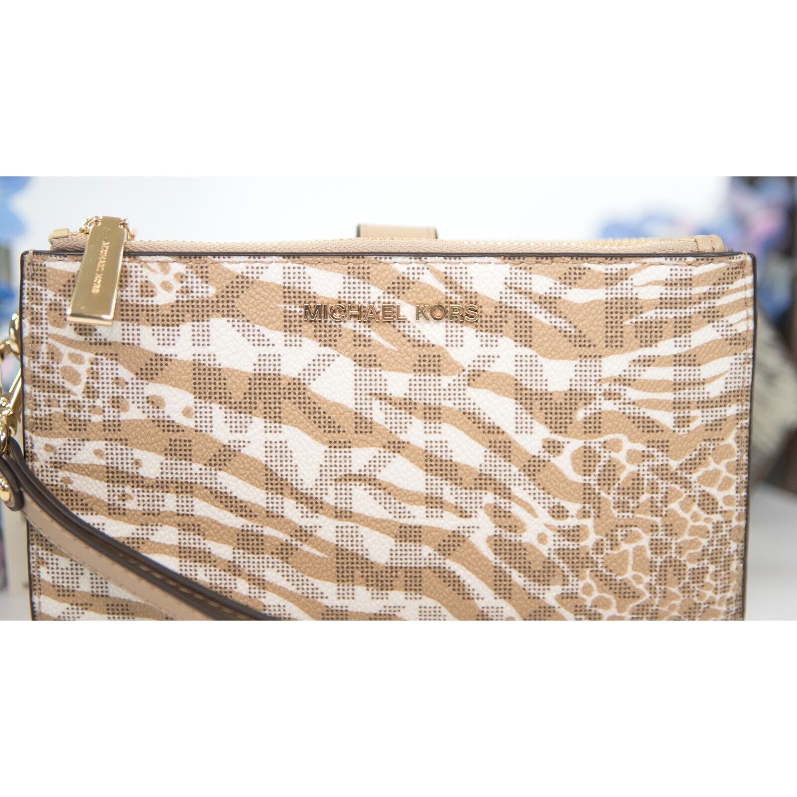 Michael Kors Jet Vanilla Monogram Camel Zebra Double Zip Phone Wallet NWT