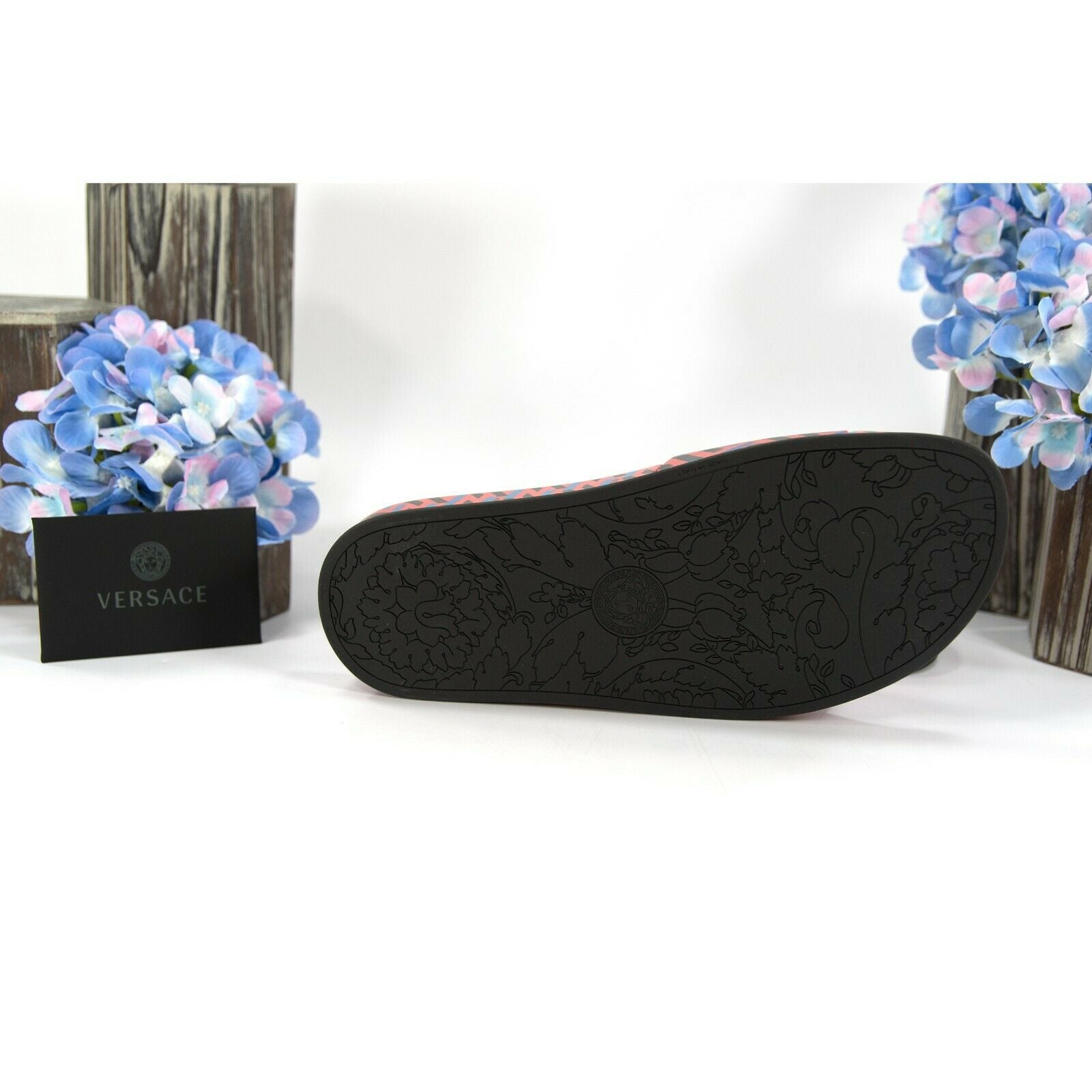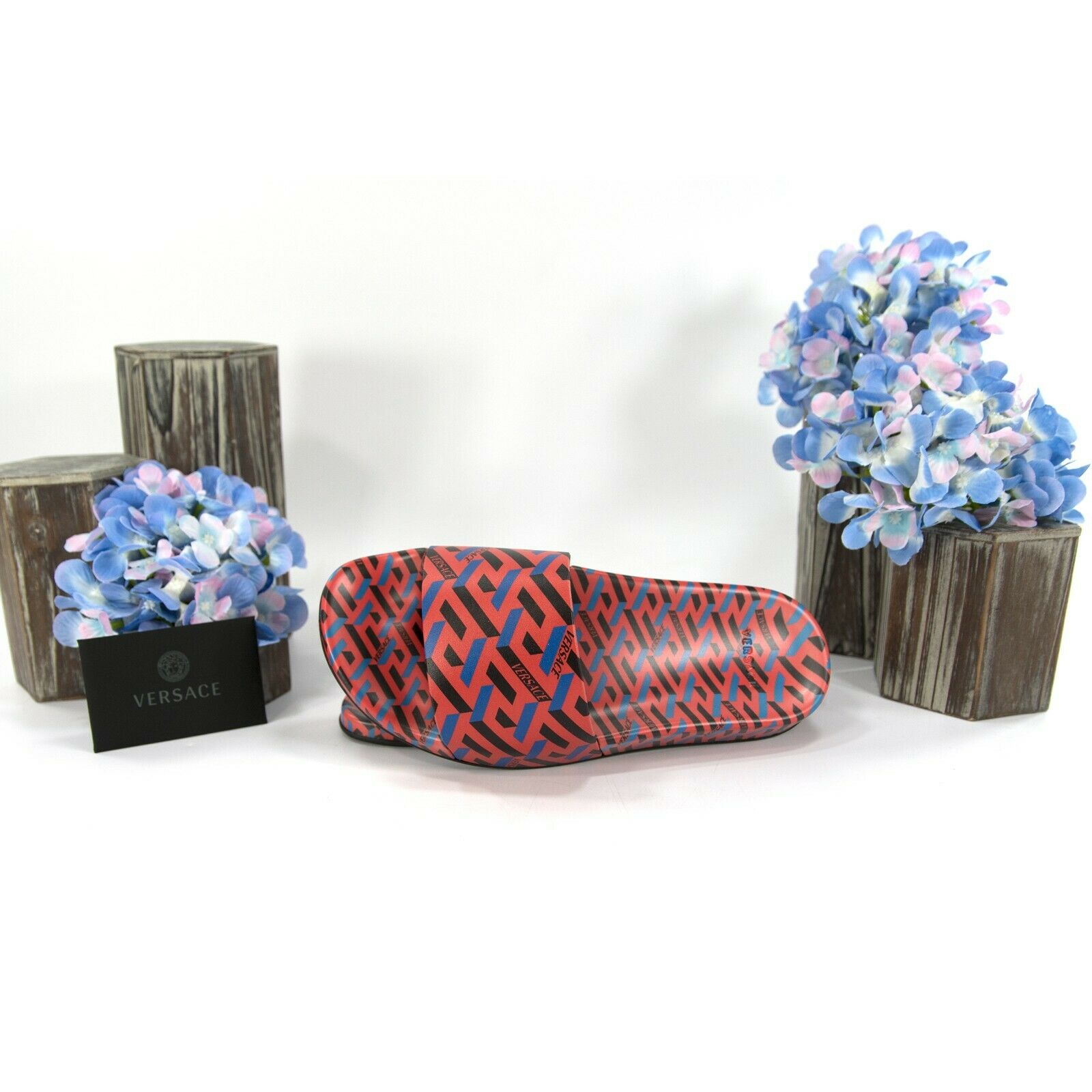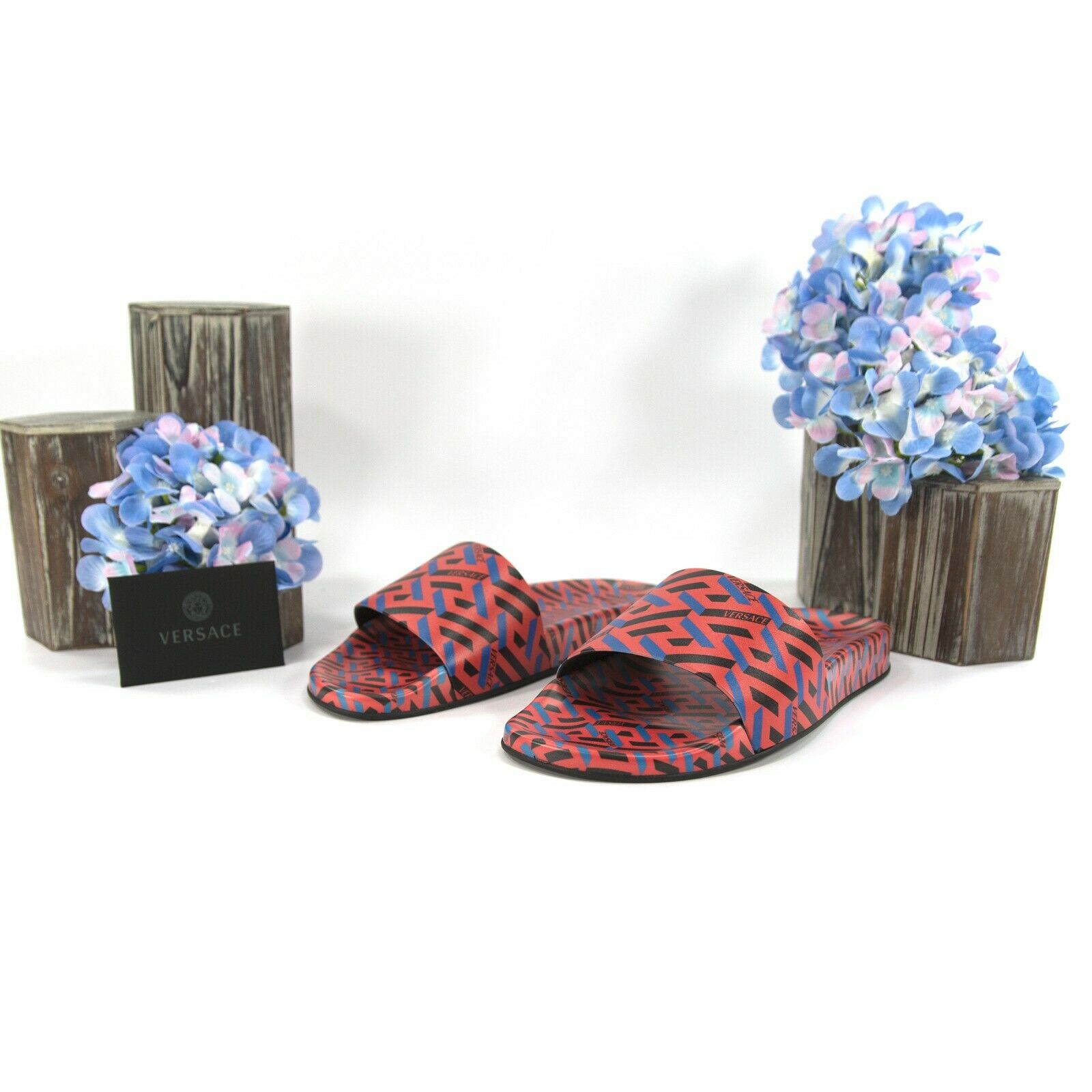 Versace Domma Stampa Greca Orange Peel Blue Logo Leather Pool Slides 37 NIB